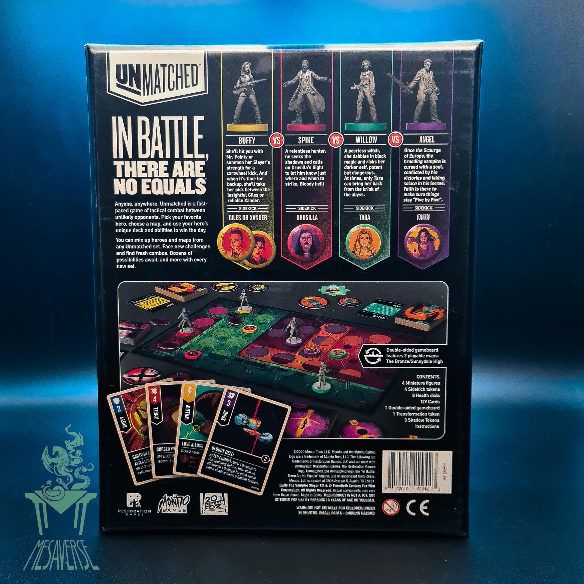 Unmatched: Buffy the Vampire Slayer features four heroes. Buffy will hit you with Mr. Pointy or summon her Slayer's strength for a cartwheel kick. When it's time for backup, she'll take her pick between insightful Giles or reliable Xander. Spike, a relentless hunter, seeks the shadows and calls on Drusilla's Sight to let him know just where and when to strike. Willow, a peerless witch, dabbles in black magic and risks her darker self, potent but dangerous. At times, only Tara can bring her back from the brink of the abyss. Angel, once the Scourge of Europe, is cursed with a soul, conflicted by his victories and taking solace in his losses. Faith is there to make sure things stay "Five by Five".