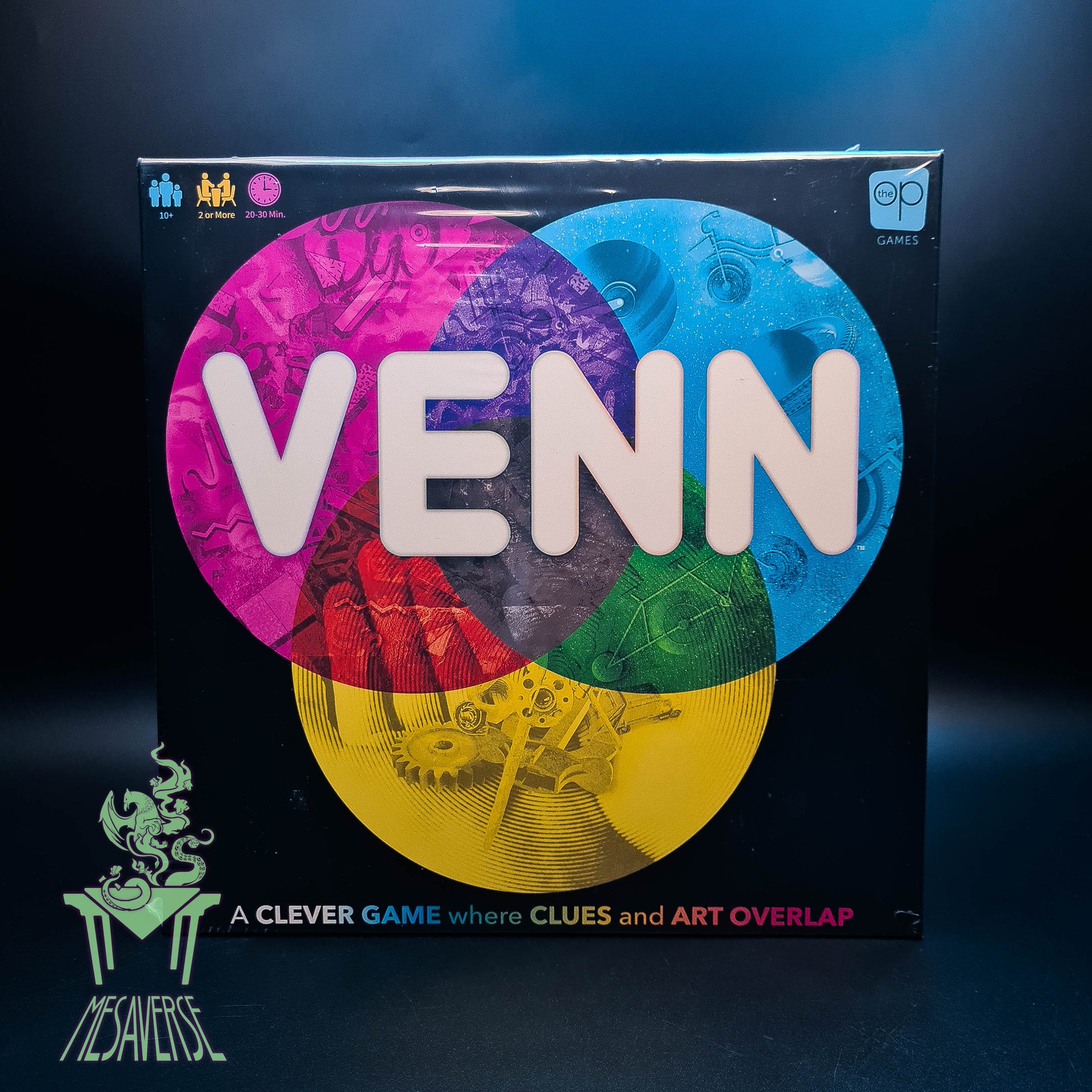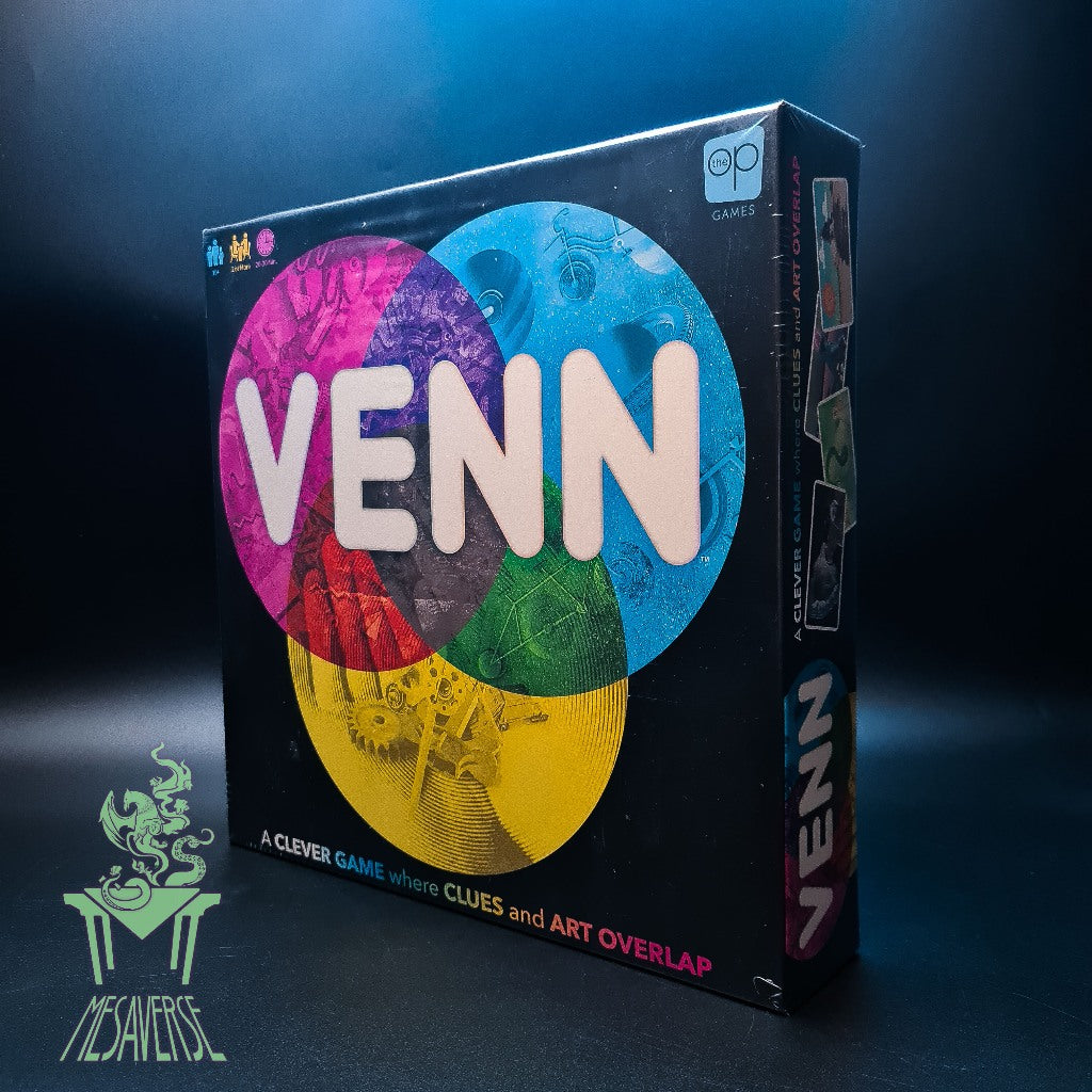 Your goal in Venn is to get your teammates to guess a secret code first. Twelve word cards will be laid out at random, and the code that the cluegivers see has three numbers on it from 1-12. Three large plastic circular overlays in yellow, blue, and pink are laid out on the table, with the circles overlapping to create a large Venn diagram. Each cluegiver has a hand of cards showing absurdist imagery, and they'll take turns placing cards into various sections of the Venn diagram to try to give clues to their teammates about the words indicated by the code.