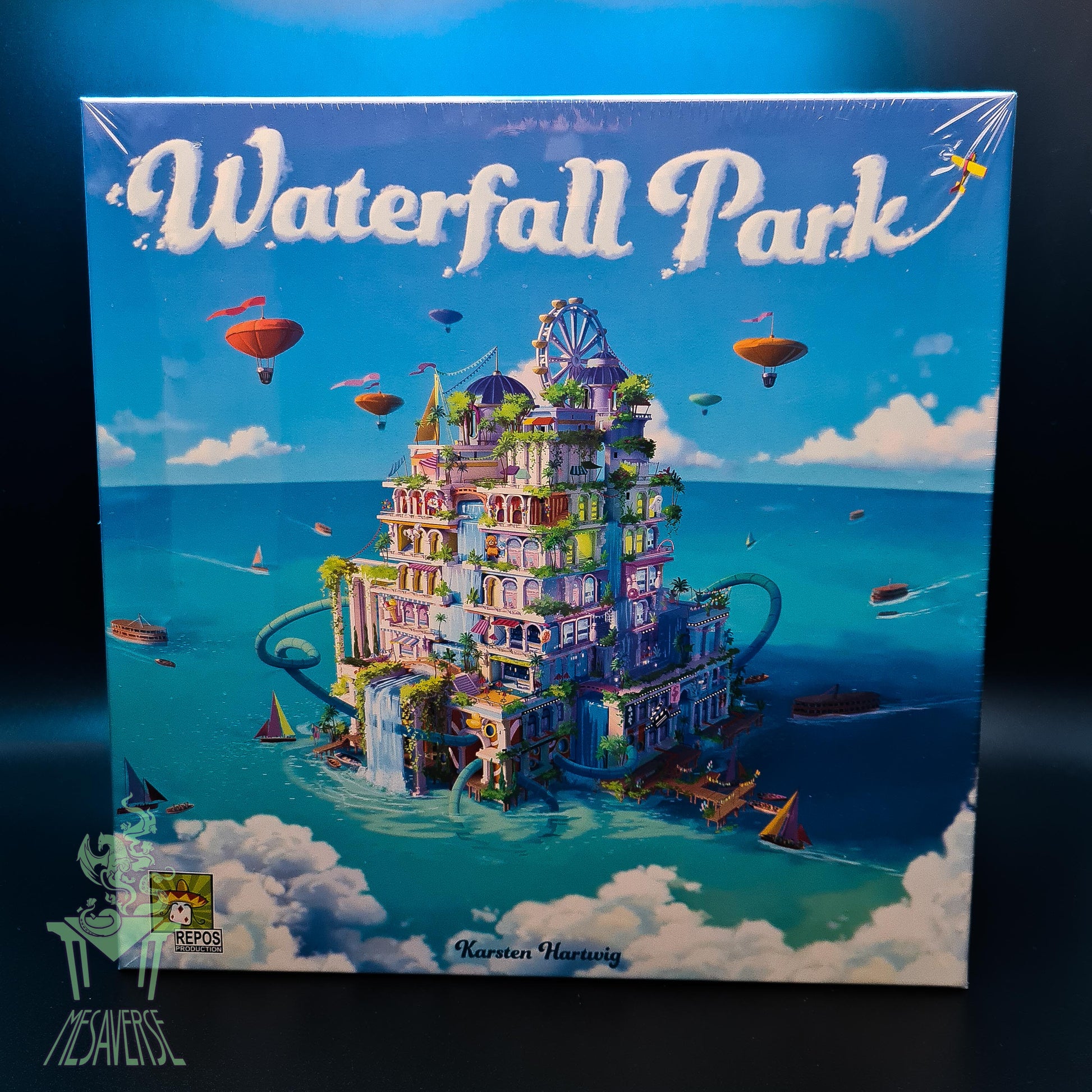 Welcome to Waterfall Park. The goal of the game is to trade and exchange attractions to build the biggest amusement park in the world. The particularity of this park is that it is built vertically on huge towers in the middle of the ocean.