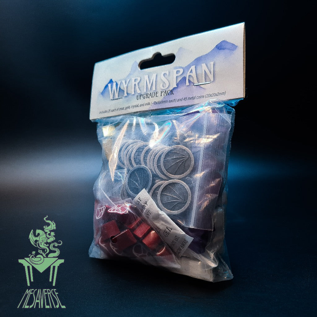 45 metal coins and 104 wooden resource tokens. All metal coins are identical, and there are 26 each of the resource tokens: meat, gem, gold, and milk.