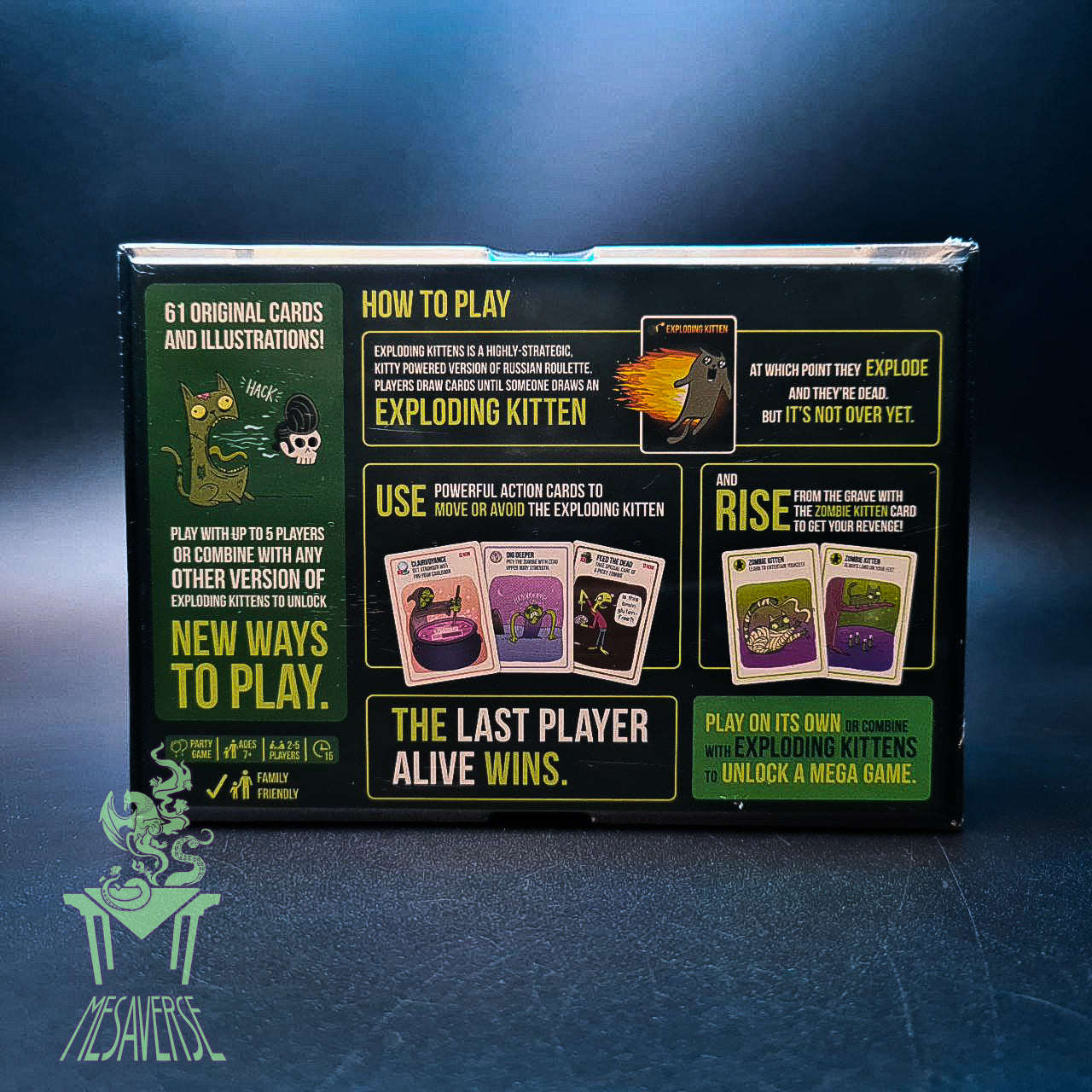Number of Players: 2-5 Zombie Kittens is still the highly strategic, kitty-powered version of Russian Roulette that you love, but it introduces a brand new deck of cards so that your game doesn’t end just because you blow up. Only living players can win the game, but dead players now get to keep the cards in their hands when they explode. They also get to play certain cards to torment the living players. And they can even come back from the dead to win the game. Zombie Kittens can be played by itself or can be combined with Exploding Kittens.